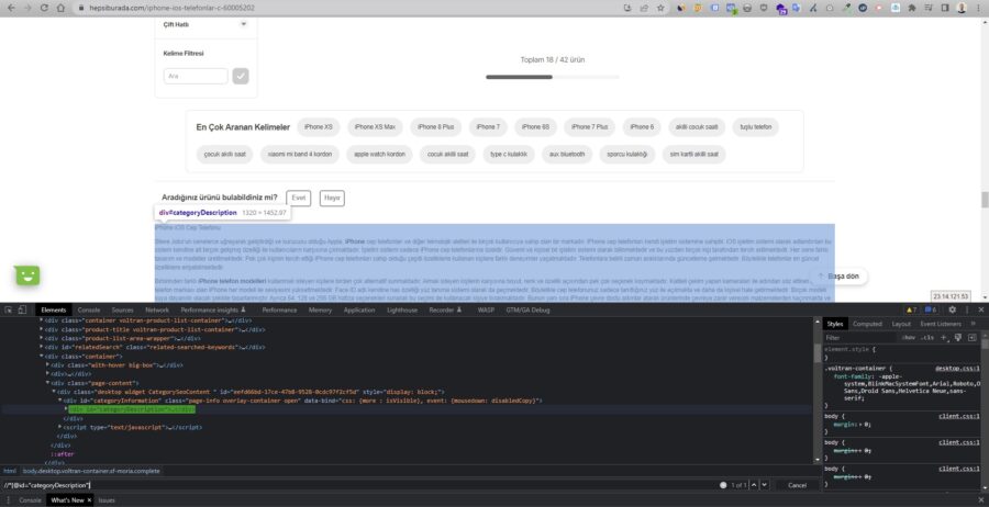 Görseldeki yönlendirmeyle içerik alanının XPath’ini alıyoruz(//*[@id=”categoryDescription”]). Şimdi yapmamız gereken, kopyaladığımız XPath değişkeninin karşılığı gelen alanı farklı kategorilerden de test etmek.